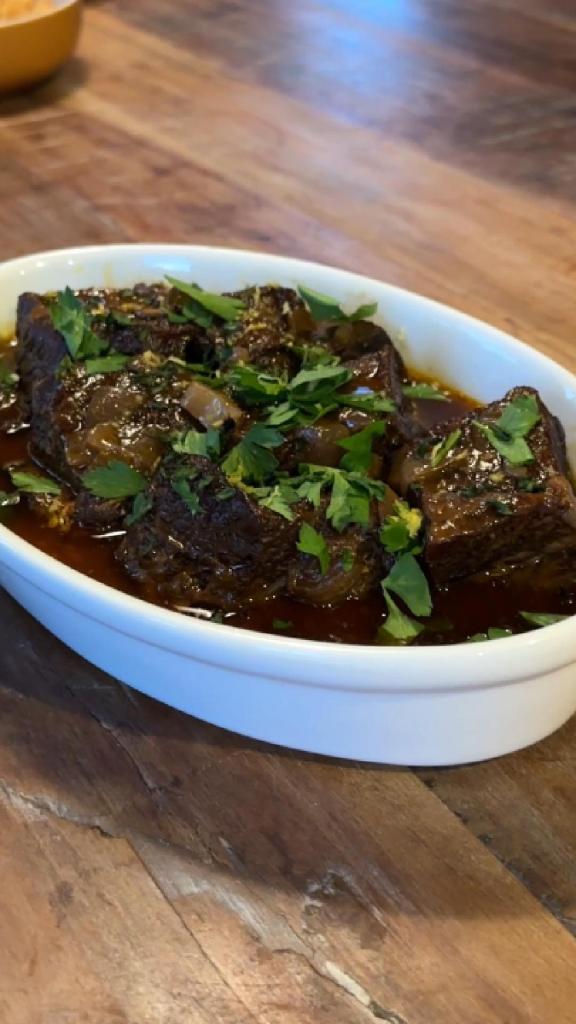 This recipe, as it states is a crowd pleaser and really I’ll be putting this in rotation. I originally followed this recipe with bone-in cuts as suggested. The night before the dinner with Wyatt, I went to Costco they only had Short Rib cuts with NO BONES. They didn’t look as fatty and had less collagen but I bought them anyway and decided to cook them ahead of time. They were great but bone-in are just spectacular…. Final thoughts, if you have the bones, yes follow the recipe, if you don’t, check the meat 30 min early depending on your oven. Mine were done early and I reheated the day of the dinner. I saved the braising liquid and added a bit of cornstarch to make a gravy and topped with lemon zest and parsley.
